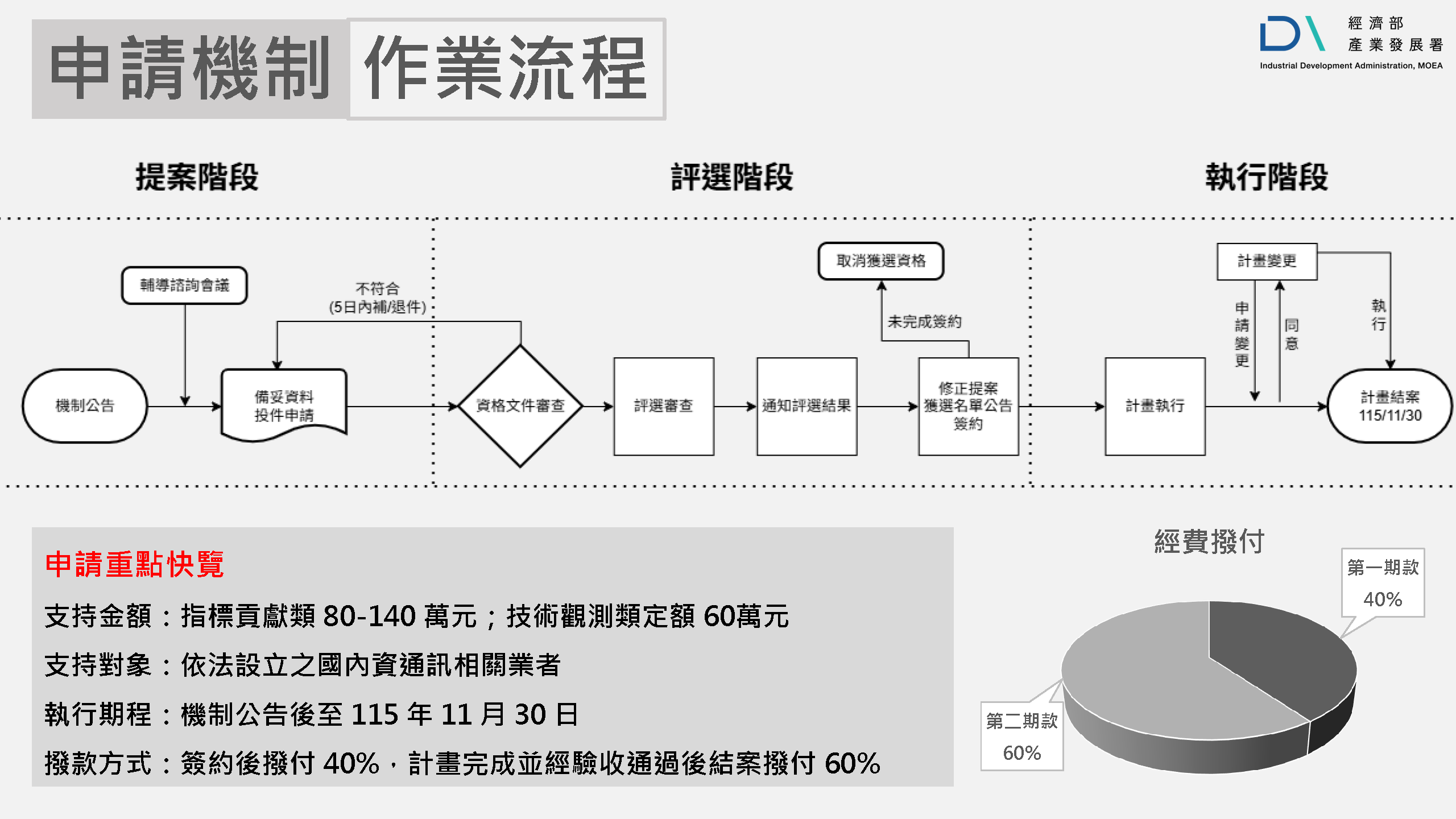 鑑於國際通訊標準制定組織為全球次世代通訊技術發展之關鍵場域,其標準方向直接影響未來通訊技術演進、產業布局與市場發展(如3GPP等),本機制於 115年度將優先關注國內業者參與國際通訊標準制定相關組織之情形,並同步鼓勵參與其他次世代通訊與衛星通訊相關國際組織,深化技術交流、標準參與及國際合作,促進我國產業與國際接軌。